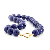 Lapis Lazuli is actually a mixture of three minerals. Lazurite (deep ultramarine blue). Sodalite (a denim blue with a sort of dappled texture) and Calcite (white) often with a sprinkling of golden pyrites crystals. The relative proportions and mixing defines the grade of Lapis Lazuli. The best is ultramarine (but not too dark) with an even fine patterning and not too much pyrites or pale patches of calcite. Actually, these are a particularly good and consistent colour. 15mm beads and AAA+ grade Lapis Lazuli beads of this large size are extremely uncommon. There is a lot of Lapis Lazuli in this necklace (there is 3x more Lapis in a 15mm bead as a 10mm bead and the sheer amount of Lapis required to make a full necklace of this impressive bead size explains why they are so uncommon). Natural colour Lapis Lazuli that has not been mucked about with is getting harder to find and buying Lapis is a bit of a minefield. The market has no shortage of dyed Lapis (some of which isn't even Lapis) and synthetic Lapis - it is easy to get caught out by an apparent bargain. This isn't cheap, but it is a bargain because it is exactly what it says it is. We know because it comes straight from the workshop (run by two brothers) who cut the stone for our boxes. They also make beads from the higher grades of rough Lapis. In fact I am pretty sure we have met the Afghani family that provided the Lapis as the storage unit where the blocks of Lapis arrive is close to their workshop. 47cm long, this really is very beautiful Lapis Lazuli with a high gloss polish. Gold and Lapis go naturally together, so we have added one of our large easy to use gilded sterling silver hook clasps. 15mm beads, all hand knotted. A classic Lapis Lazuli necklace of outstanding quality.