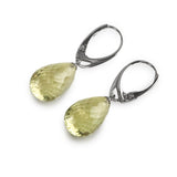 The magic of quartz is that it comes in so many forms, nearly all of them eye catching. Very slight changes in the crystalline structure, temperature, radiation or trace elements can produce gems so different, you'd barely believe they were related. Lemon Quartz is what we might think of as a 'hot' quartz. It probably formed as Amethyst but was then exposed to heat which altered its chemistry and colour. Hence there is a lot less Lemon Quartz in the world than there is Amethyst as the colour only emerges at a very narrow range of temperature. If it gets too hot, it goes a darker citrine colour and eventually, green. A fresh Spring like feel from natural gems of high quality. Faceted 17mm x 10mm drops. 3.5cm overall drop.