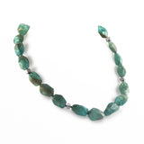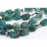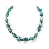 You won't often see an Apatite necklace with large transparent crystal faceted stones like this. In fact I have been looking online and can't find anything across the globe that comes close. When I bought the stones (15 years ago!), I bought a small batch as the colour is just fantastic. There was enough for two necklaces and this is the second and last. As a gemstone it has an interesting history. Called 'the deceiver' it is extremely easy to mistake for Tourmaline, Topaz or Sapphire and in times past that certainly happened. The colour ranges from deep blue to green, but I like this neon colour and its rufty tufty wild gem look.  Apatite crystal beads rarely come in this size and intense colour. Transparent but strongly occluded in a visually interesting way.  Natural Emerald often looks like this. A true rarity and an impressive thing to wear. The sheer quantity of Apatite is impressive, not often you see this much Apatite in one place. Nuggets are 15-21mm with brushed solid sterling silver chunky spacers to add some contrast. The length is 45cm with a nice easy to use sterling silver hook clasp.