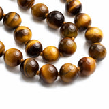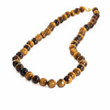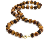 So, Tiger's Eye. You'll know it because it has that beautiful amber cat's eye effect called chatoyancy. It's actually a form of quartz that has formed with long threadlike crystals of Limonite trapped inside, which gives the colour and optical effect. That also means it is glossy and extremely tough, hence will look just as good after decades of wear. So these beads are slightly over 8mm. 46cm long, we have added one of our gilded sterling silver clasps. Warm tones like this are really very wearable.