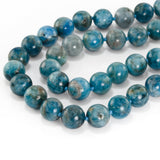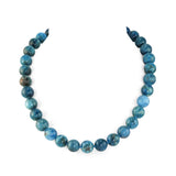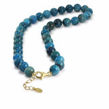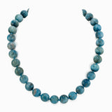 You won't often see an Apatite necklace. As a gemstone it has an interesting history. Called 'the deceiver' in its various forms it is extremely easy to mistake for Tourmaline, Topaz or in its clear crystal form, Sapphire and in times past that certainly happened (sometimes by accident). The colour ranges from deep blue to green and this example has a look that falls half way between cloudy aquamarine and chrysocolla. Few people in the UK jewellery trade buy Apatite (or even know of it), it's too variable and not easy to come by. We buy it because we like unusual and slightly exotic gems. Rare and unusual doesn't always mean expensive. Mother Earth produces thousands of gemstones, so why limit ourselves to a few well known ones? Hand knotted 12mm beads and 46cm long with a gilded sterling silver clasp plus 5cm extension chain.