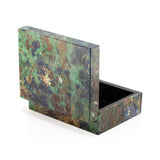 Remember those art gallery trips at school, where someone always pointed out that the intense ultramarine blue in renaissance paintings was achieved using Lapis Lazuli? Well, in a lot of cases what they actually used was its close cousin Azurite. An honest error in most cases as Lapis, Azurite and Chrysocolla are all related minerals based around copper. A box is a brilliant and practical way to appreciate the beauty of a fine mineral specimen. Here you can see how the Azurite and Malachite/Chrysocolla have formed in the gaps between broken pieces of (probably) metamorphised limestone. This is called 'brecciated'. Pretty sure this was mined in the Utah/Arizona/New Mexico region. Of course there will be traces of other minerals like Cuprite and Malachite swirled into the mix too. Isn't nature wonderful? Lined with Black Onyx for extra durability and detail. A box for people to envy, it will immediately catch the eye of visitors and they'll want to touch it. 10.5cm x 8cm x 4cm (3 inches by 4 inches).