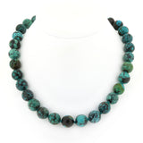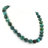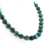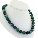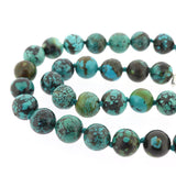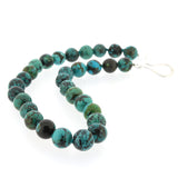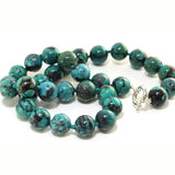 We're all familiar with Turquoise from Mexico and Nevada, but varieties of Turquoise do crop up elsewhere in the world. Like China. We have a little project to pick up samples of some of the more exotic types on our travels. Just for curiosity value really, because we know we have customers who share our love of the strange and uncommon. Every mine produces a distinct colour and form of Turquoise, with its own patterns like a fingerprint. China is a bit more prosaic and their mines tend to have numbers rather than names, so whilst we know this is from Hubei province, it is hard to name the specific mine, but likely to be from Xhuxi or Yungai. Chinese Turquoise is still a bit less expensive than American Turquoise (hence this bargain price for a Turquoise necklace), but that is likely to change as the world realises that really good Turquoise is emerging from China. These are natural Turquoise 12/13mm beads with the Turquoise mixed in with the darker mineral in which it forms (matrix). Certainly a necklace with character. One of mother nature's best. 48cm with a large sterling silver bolt ring clasp.